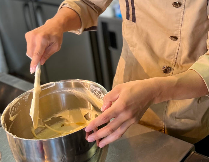 生地の配合は素材の特性を活かし、焼き上げ時の温度管理は1秒、1度単位で徹底。空気をしっかり含ませる製法でふんわり感を実現しました。